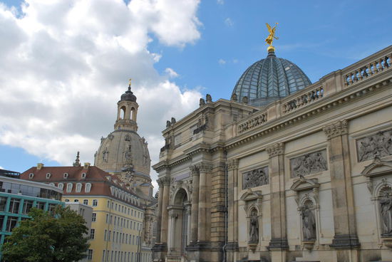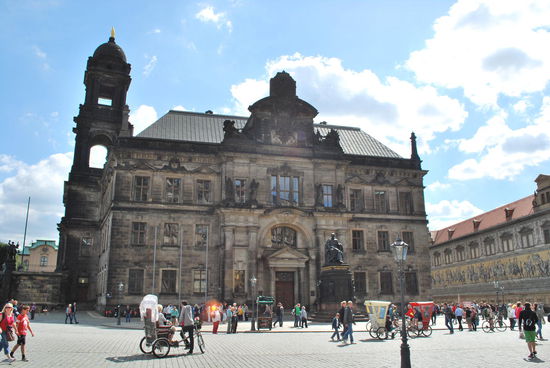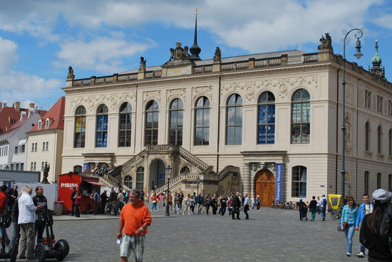 Der heute hier stehende Bau der bildschönen sächsischen Staatsoper ist eigentlich die 3. Version des ursprünglichen Gebäudes. 1841 wurde die Erstversion angefangen, zu bauen. 1869 durch ein Feuer zerstört. Die 2. Version wurde wohl 1871 fertiggestellt und dann 1945 fast völlig ruiniert. 1985 wurde die 3. Version eingeweiht. Das Elbhochwasser von 2002 rückte der 3. Version bedenklich zu nahe und verursachte schon wieder Millionenschäden am Bau. Die Semperoper steht also offensichtlich unter keinem guten Stern. Ich persönlich kann sie auch nur von außen betrachten, denn für eine Führung durch´s Innere ist so mal eben schnell kein Ticket zu bekommen und vorab habe ich es versäumt, mich darum zu bemühen. Aber ich komme wieder...