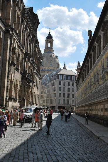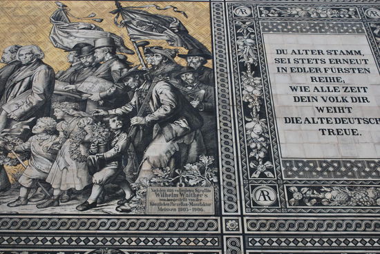 Fürstenzug - das ist wirklich beeindruckend schön ! Auf 102 m und auf 23.000 Fliesen aus Meißener Porzellan aufgetragen. Es ist das größte Wandfliesengemälde der Welt und wurde 1907 fertiggestellt. Es zeigt die Ahnengalerie der Wettiner. Die Fliesen wurden bei 1380 Grad scharf gebrannt und so überlebte das gigantische Fries auch die Bombenhitze 1945 fast unbeschädigt.
