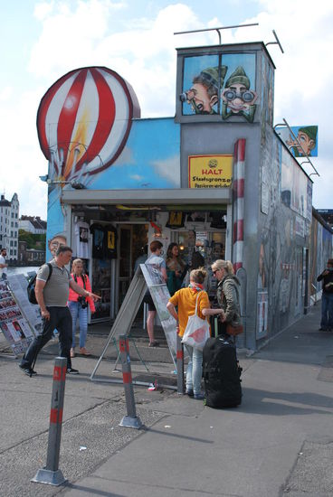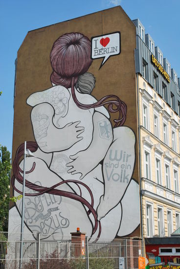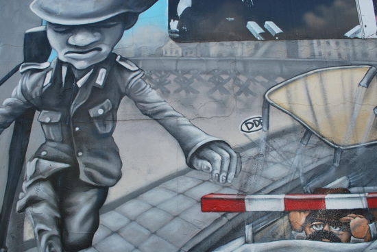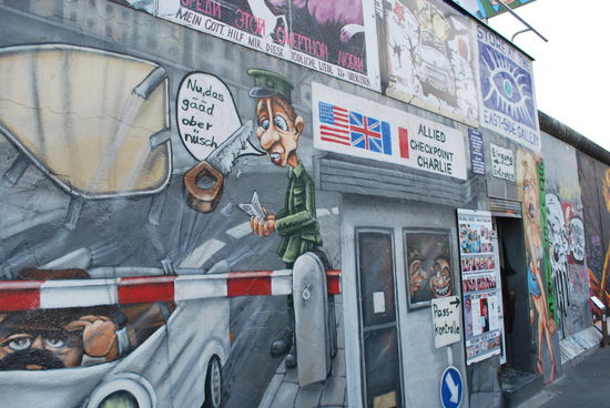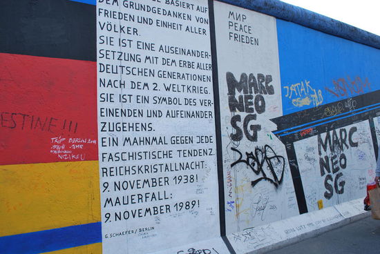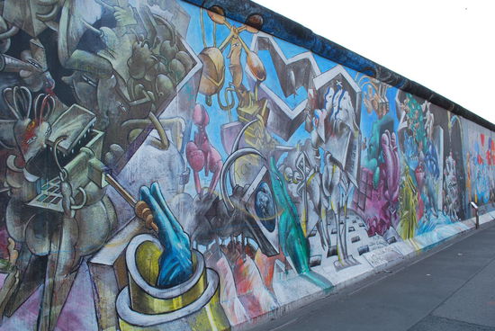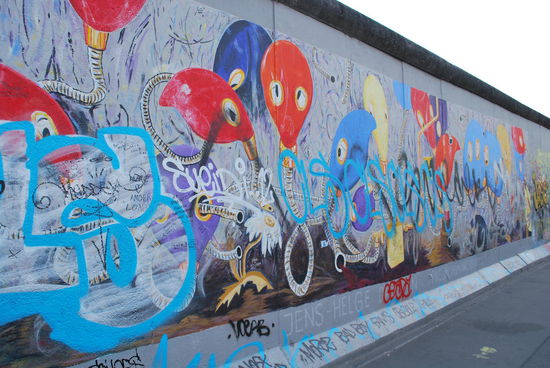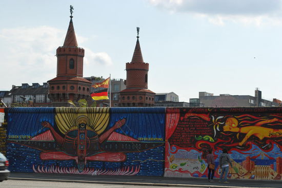 In Friedrichshain. Die East Side Gallery. Auch hier steht noch ein langes Stück Mauer, bunt bemalt und beschriftet.