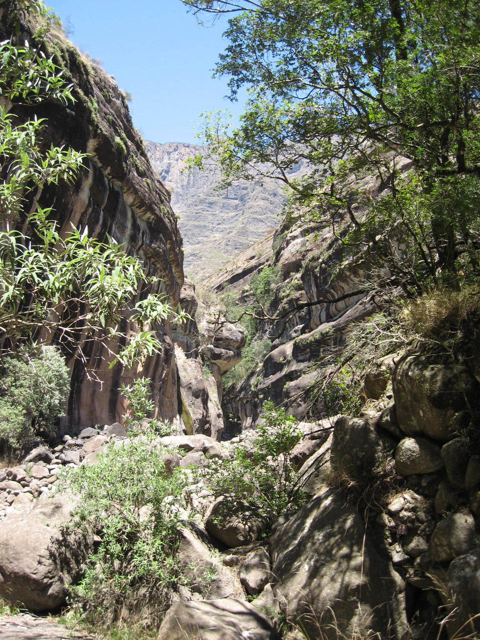 Der nächste Tag war der letzte bevor wir zum Chateau Willy nach Johannesburg fuhren. Wir besuchten davor das Amphitheater in den Drakensbergen und wollten eigentlich ja zum Tugela Wasserfall laufen, aber die Zeit hatten wir nicht und der Wasserfall hatte ja auch kein Wasser. Die Sonne schien und Steffi schaffte es sogar bis zur Klamm zu laufen.