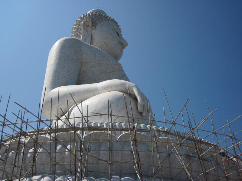 Weithin sichtbar ist die Statue Big Budda auf dem höchsten Berg von Phuket. Sie ist teils noch in Bau befindlich, trotzdem achten hier wie in allen Wats Mitarbeiter auf angemessene Bekleidung (über Schultern und Knie).