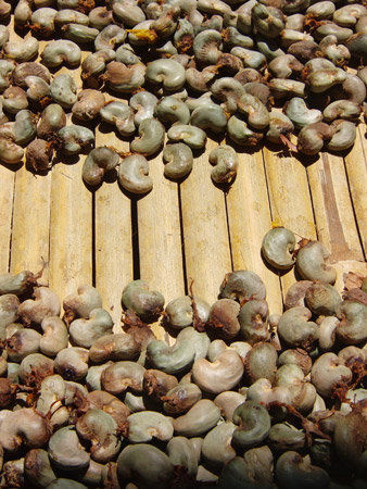 Neben dem Haus wuchs ein Cashewbaum, und wir konnten immer wieder hören wie die reifen Früchte auf das Dach fielen. Die eigentliche Frucht ist das, was wir als Cashewnuss kennen und sitzt unten am gelben, fleischig verdickten Stiel - dem Cashewapfel. Diese birnenförmige (Schein-)Frucht wird zu Marmelade, Saft oder Schnaps verarbeitet. Die Cashewnüsse werden auf Bambusgestellen zum Trocknen aufgelegt.