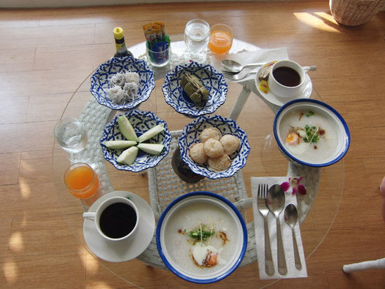 Heute früh gab es ein Frühstück, auf das wir uns schon den ganzen Urlaub gefreut hatten. Wir wussten aus den diversen Bewertungsportalen im Internet, dass in unserem Guesthouse Frühstück nach Thai Art serviert wird, und so genossen wir Reissuppe mit Ei, Khanom Krok, Klebreis im Bananenblatt, süße Kokosbällchen und eine Guave. Es war ausgezeichnet, aber auch sehr sättigend!