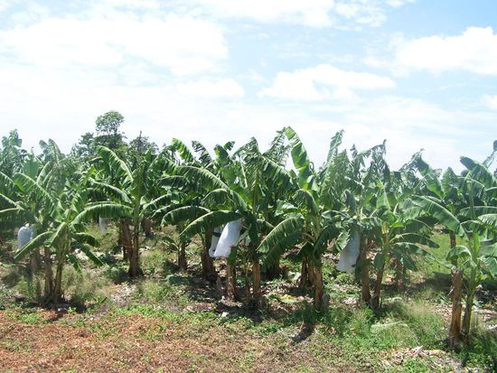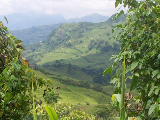 Gegen Mittag fahren wir weiter. Zuerst stecken wir im Stadtverkehr fest. Das Navi führt uns durch Viertel, da möchte man eigentlich nicht sein. Dann endlich kommen wir auf die Hauptstraße und rollen stadtauswärts. Der Verkehr wird ruhiger, die Straße enger und die Löcher größer. Aber es soll noch schlimmer kommen. Zunächst durchqueren wir unendlich große Bananenfelder. Die Bananen wachsen in lange Plastetüten hinein.