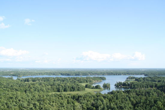 Die landschaftlich reizvolle Straße führte über eine Brücke in die USA. Wir haben aber vorher am 1000 Island Skydeck angehalten ( ein Aussichtsturm, der letztes Jahr von einem Deutschen Paar Anfang 30 gekauft wurde und nun von Ihnen bewirtschaftet wird.).