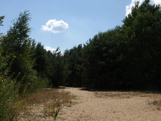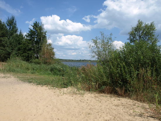 Man muss genau hinsehen, um den Schleichweg zum Stoßdorfer See zu finden, den uns Simone detailgetreu aufgemalt hat - die kleinen Teer- und Schotterstraßen, die sich durch winzige Ansiedlungen winden, sind gar leicht zu übersehen. Aber es lohnt sich - bei der schwülen Brandenburger Hitze lechzen wir nach frischem Nass, und wir werden mit einem schneeweißen Strand unter Kiefern belohnt. Das Wasser ist warm und bräunlich, und letztendlich verdanken wir den See dem ehemaligen Braunkohlentagebau. Die Natur hat sich anfangs nicht bedankt - rücksichtslos wurden mit den Großbaggern Wunden gerissen, und die Gegend glich zeitweise einer Mondlandschaft. Da musste der Mensch Wiedergutmachung leisten, viele Teile unter Naturschutz stellen und Fauna und Flora die Ansiedlung erleichtern. Das ist gelungen. Auf den sauren, nährstoffarmen Böden gedeihen Pflanzenarten und wuseln Insekten; seltene Vogelarten wie der Wiedehopf, die andernorts keine Chance hätten, haben sich angesiedelt. Die Vogelinsel mitten im See ist im Herbst spektakuläres Abflugterminal für Zugvögel, die sich gegen Süden aufmachen und hier Rast halten, wie die Küstenseeschwalbe und der Kranich. Momentan geht es eher ruhig zu; ab und an dringt das Geschnatter der Graugänse zu uns herüber. Vor der Kamera wirft sich ein Teichfrosch in Positur und lässt sich von allen Seiten bewundern.