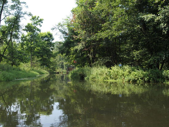 Wir dagegen müssen nicht einmal den Kopf in den Nacken legen, um die Umgebung zu bewundern - sie liegt auf der unbewegten, stillen Spree und ihren Fließen wie in einem Spiegel vor unseren Augen. Dennoch gleitet der Blick immer wieder rundherum und macht an einem Schwarm türkis schillernder Prachtlibellen, einem in der Sonne leuchtenden Blutweiderich oder an den Wurzeln der Erlen Halt, die tief ins Wasser hineinreichen. Die Erle wurde hier vor Jahrzehnten hauptsächlich angebaut und nasse Füße machen ihr nichts aus. Hier leben Biber, die wir zwar nicht zu Gesicht bekommen, dafür die von ihnen "gefällten" Bäume mit der charakteristischen Benagung.