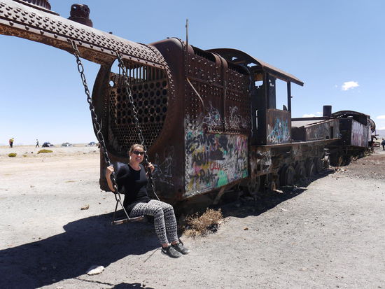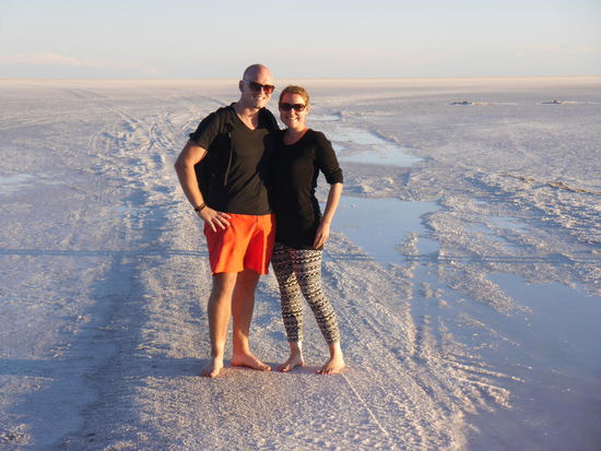 Am nächsten Morgen machten wir uns dann auf die Suche nach einer Agentur mit der wir einen dreitägigen Trip durch die Salzwüste machen wollten. Die zwei Agenturen, die wir uns aufgrund guter Referenzen ausgesucht hatten, waren aber leider schon ausgebucht. Also blieb uns nichts anderes übrig als mit irgendeiner anderen Agentur zu gehen. Ganz kurzfristig haben wir uns dann für eine viertägige Tour entschieden, da sie kaum teurer war als die dreitägige und es in Uyuni eh nicht viel zu sehen gibt und eigentlich alles nur extrem überteuert ist. Also saßen wir 30 min nach Buchung bereits im Jeep Richtung Salzwüste. Mit uns Helena und Vadim aus Weißrussland. Die zwei sahen aus als wollten sie in den Krieg ziehen (beide in Bundeswehrkleidung), waren aber wirklich richtig nett. Unser Fahrer konnte kein Wort englisch, aber das hatten wir eigentlich schon erwartet.