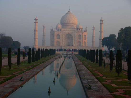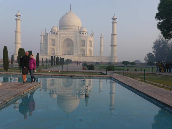 Gestern ging es also mit dem Bus weiter nach Agra wo das letztes großes Highlight unserer Reise auf uns wartete: Taj Mahal. Bereits bei unserer Ankunft konnten wir von der Dachterrasse aus einen ersten Blick auf dieses fasziniernde Bauwerk werfen. Richtig besichtigt haben wir es dann aber erst heute. Bereits um kurz vor 6 klingelte unser Wecker. Temperaturmäßig näheren wir uns so langsam den deutschen Verhältnissen. Während es mittags recht mild ist, ist es morgens und abends richtig kalt. Also ging es warm eingepackt nach einem kleinen Frühstück im Café mit der kleinsten Küche, die wir je gesehen haben, endlich los. Pünktlich zum Sonnenaufgang wurden die Tore geöffnet und so standen wir dann schließlich vor dem imposanten Werk - dem schönsten Bauwerk der Welt, dem größten Liebesbeweis aller Zeiten. Und waren einfach nur sprachlos. Allein dafür ist Indien wohl schon eine Reise wert.