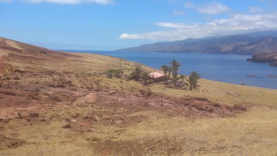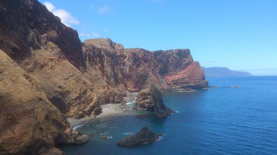 Die erste Wanderung will ich auf dem östlichen Ende der Insel machen, die man auch beim Landeanflug sieht, hier überwiegt das Lavagestein. Da die im Wanderführer vorgestellte Tour recht kurz ist möchte ich sie mit der benachbarten Tour von Machico nach Carnical verknüpfen. An dem kleinen Häuserblock am Busbahnhof, zu dem mich die Ticketverkäuferin geschickt hat, versuche ich mich an den Fahrplänen zu orientieren. Erstmal scheinen mir recht ähnliche Routen von verschiedenen Linien durcheinandergewürfelt, in manchen Orten hält nur jeder zweite Bus. Ich habe eine halbe Stunde Zeit und sehe mir die nähere Umgebung an: zwischen Busbahnhof und Markthalle sind ein paar Gassen mit bunt bemalten Türen, hier sind Wohnhäuser mit Bars und Galerien gemischt. Zum Museum "story of Madeira" gehören große Glaskästen mit Schiffsmodellen. Im Hafen liegt übrigens ein Nachbau von Kolumbus' Schiff "Santa Maria" (er hat die Tochter des hiesigen Gouvernours geheiratet).