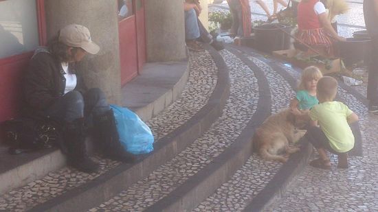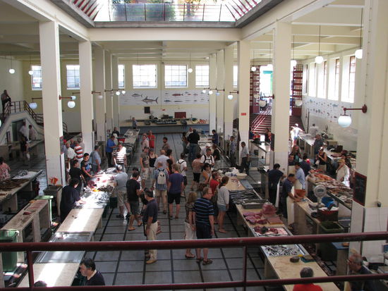 Samstag sehe ich mir Funchal an. In der Markthalle ist Freitag und Samstag deutlich mehr los als sonst. Vorne sind die Blumenverkäufer und im und um den Innenhof Obst- und Gemüsehändler, an den Seiten abgeschlossene Läden von Strickwaren, Wein und Fleischereien, hinten der modernere Fischmarkt mit fast schon klassischer Besuchergalerie zum Fotografieren im Obergeschoß. Vorne und an den Seiten sind traditionelle Azujelos (blaue Kachelbilder) an den Wänden und die Blumenverkäuferinnen tragen Tracht, der Innenhof mit Bäumen und wuchernden Blumen verleiht dem Markt eine ausgesprochen angenehme Atmosphäre, wobei ich in Spanien meiner Erinnerung nach architektonisch noch schönere Markthallen gesehen habe. Auf Madeira wachsen sehr viele Bananen, auch einen kleine Art, die aber anders schmeckt und etwas größer ist als die mir bekannten Baby - Bananen. Dazu werden Passionsfrüchte in vielen Varianten verkauft: sie sehen aus wie kleine Orangen, Zitronen oder Bananen und haben den entsprechenden Beigeschmack; ich vermute das Ergebnis von Gentechnik - aber tatsächlich gibt es in Südamerika 200 Arten von Passionsfrüchten. Am Samstag (und vielleicht, weil ich kauflustig wirke) werden sehr viele davon zum Probieren angeboten. Sie sind auch überraschend flüssig und süßer, als ich sie kenne - die, die ich kaufe, dann leider wieder nicht.