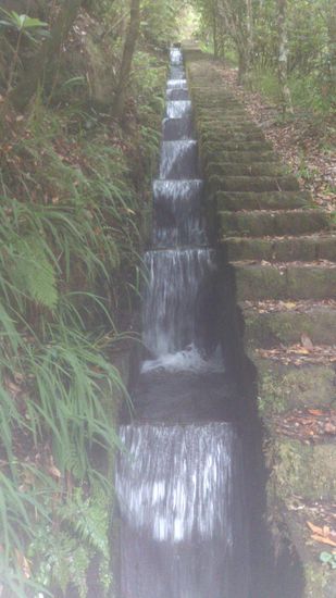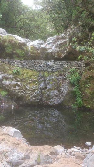 Schließlich sehe ich im Wanderbuch nach und kehre um: ich hätte nach einer halben Stunde an einer kleinen Levada abbiegen müssen, hier geht es steiler hoch, bald kommt man an einen breiteren Fluß voller Felsen. Es geht weiter bergauf und der Wald wird durch hohe Sträucher und schließlich durch eine kleine Hochebene abgelöst. Hier ist der Weg nicht mehr erkennbar und eine Wolke hat sich hier festgesetzt, die Sichtweite ist unter 50 Metern. Ich bin froh, als ich nach knapp 10 Minuten das beschriebene verlassene Gehöft knapp unter dem Plateau sehe. Bald sehe ich die ersten Wanderer nach einer Familie im Fluß. Es folgt ein längerer gerader Abschnitt bevor es im Wald wieder etwas unübersichtlich wird, bis ich an eine breite Levada komme, die sich in Kaskaden ergiesst. Einige Minuten später bin ich wieder an der Forellenzucht. Da ich hungrig bin und es bedeckt ist gehe ich in das Restaurant und esse Degenfisch, der kommt aus der Tiefsee, die nah an Madeira heranreicht. Die ürsprünglich geplante zweite (kurze) Wanderung zum Aussichtspunkt Balcôes erübrigt sich auch weil es keine Fernsicht mehr gibt, es regnet auch mehrmals etwas.