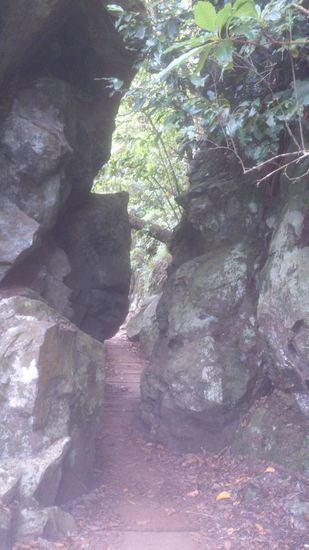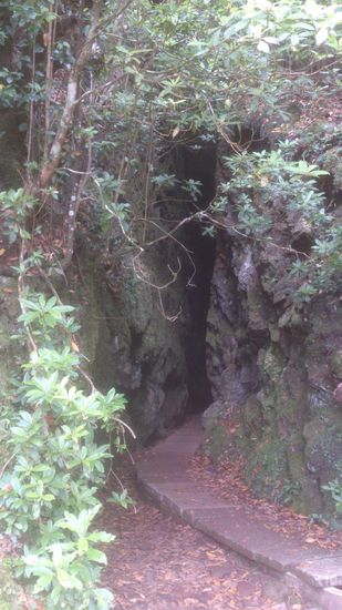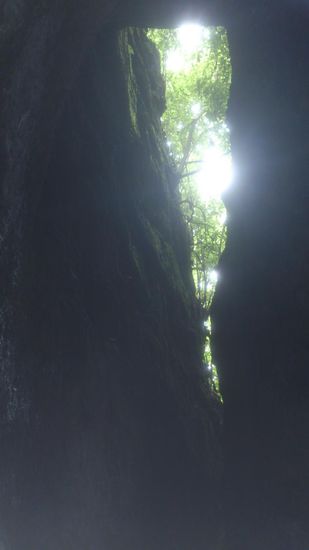 Sonntags fahren weniger Busse (nur eine Möglichkeit zurück), aber mittlerweile komme ich besser mit Madeiras Bus - App zurecht. Eine Gruppe hiesiger Jugendlicher fährt mit ihren Mountainbikes einen Teil der Strecke hoch. Ribeiro Frio besteht im Wesentlichen aus einer Forellenzucht und ein paar Restaurants an der Straße und gehört zur Gemeinde Faial an der Nordküste. Es liegt in 860 m Höhe und die Straße führ auf Sperpentinen bergauf und -ab. Gleich neben dem Parkplatz führt ein Wegweiser zum Wanderweg kurz am Bach entlang und dann die Levada entlang. Es sieht toll aus, wie die Bäume teilweise quer zum Weg wachsen. Ich kenne mich mit Bäumen nicht aus, erkenne Lorbeerbäume, Weiden und Eukalyptus, in der Ferne fallen vor allem die hohen Araukarien (kommen von der Südhalbkugel) auf. Außerdem sehe ich viele Bäume mit roter, oft abblätternder Rinde. Einige schöne Vögel kommen recht nahe, vermutlich werden sie von Wanderern gefüttert. Die Forellen im Fluß sehe ich nicht. Die Luftfeuchtigkeit ist hoch, viele Wolken ziehen durch die Schluchten, es regnet aber fast nicht, und die Temperatur ist angenehm. Aus Bequemlichkeit orientiere ich mich an der Wegbeschreibung, die ich mir mit einer App heruntergeladen habe statt am Buch. Die entspricht nicht meinem geplanten Weg und so gehe ich über zwei Stunden Richtung Portela. Dadurch komme ich aber bis zu einem eindrucksvollem langen Tunnel aus Basalt (war Lava) und Tuff (verdichtete Asche). Dahinter bietet sich der Ausblick auf eine neue Schlucht.