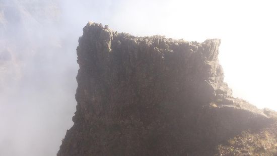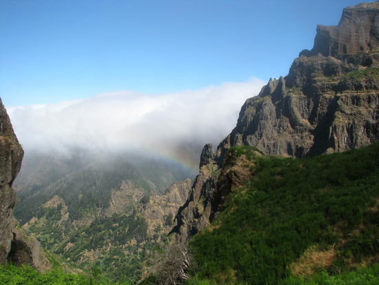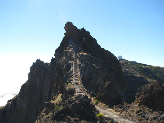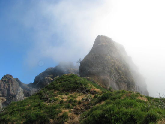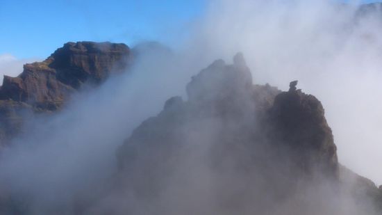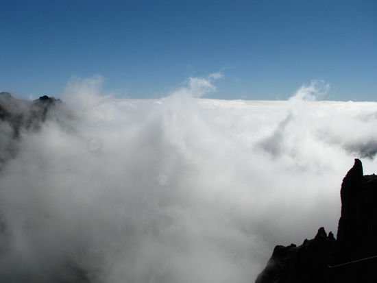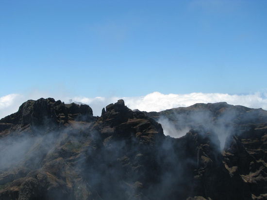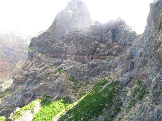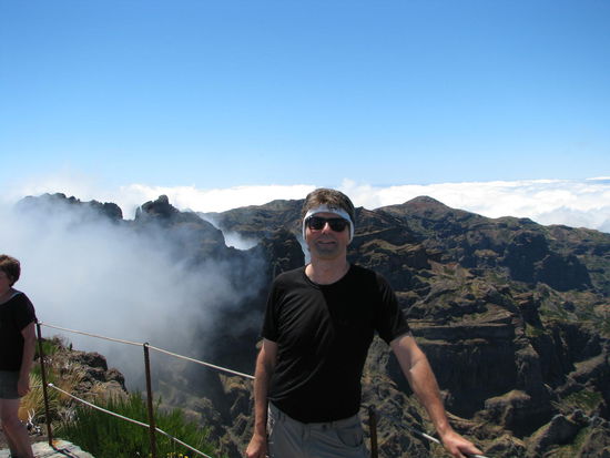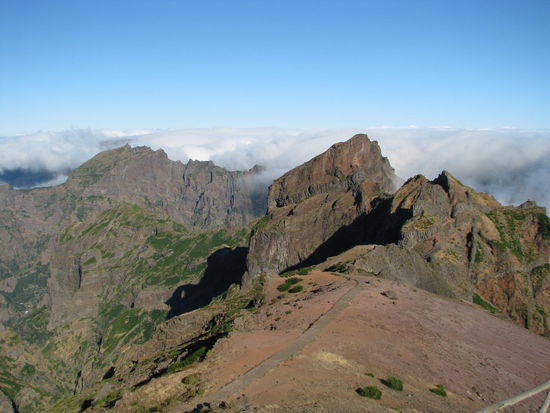 Der Weg ist trocken, aber an manchen abschüssigen Stellen kommt man auf lockerem Sand leicht ins Rutschen - ein Seil an der Hangseite reduziert zwar die Gefahr, aber es macht schon Sinn, nicht alleine zu wandern. Vor ein paar Jahren wurde im oberen Teil ein neuer Weg geschaffen, da der alte öfter verschüttet wurde. In einem Tunnel schlägt sich Einer ordentlich den Kopf an. Der Führer geht bis zur Hütte des Pico Ruivo (die ein Verwandter leitet), danach führt noch ein leichter Weg 10 min bis zum Gipfelplateau. Auf der Gegend ringsum liegen dichte Wolken, aber der Wind treibt sie weiter und es sind auch mehrere Gipfel, u. a. der Ausgangspunkt, zu sehen. Nach gut einer Stunde gehen wir etwa 40 min zum Parkplatz des Pico Ruivo.