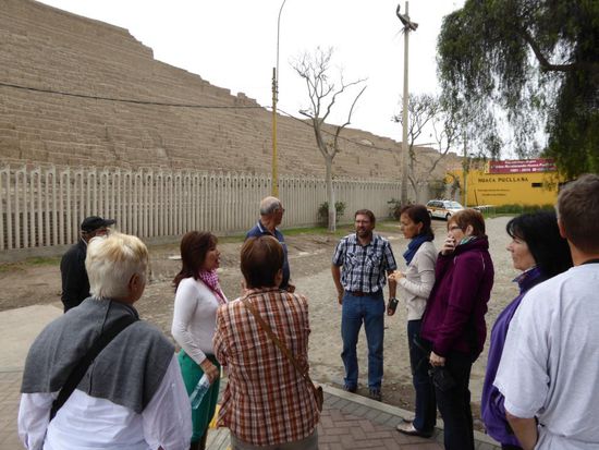 Nach dem feinen Frühstücksbuffet im Hotel sind unsere Lebensgeister wieder geweckt und wir sind bereit, Lima zu erkunden. Jenny, eine lokale, deutschsprechende Führerin erwartet uns und mit dem Bus geht es Richtung Innenstadt. Auf dem Weg kommen wir an einer neueren Ausgrabung vorbei. Huaca Puclana, eine Kultstätte der Limakultur wurde hier gefunden. Millionen von Lehmziegeln formen eine Pyramide und Jenny meint, die einzelnen Schichten würden aussehen wir Büchergestelle. Man weiss noch nicht viel von dieser Kultur, Rekonstruieren kann man noch nichts, da man noch gar nicht weiss, wie der Ort ausgesehen hat. Weite Gebiete der Stadt stehen auf den Resten dieser Kultur, wenn man weiter graben würde, würde man überall auf solche Gebilde stossen.
