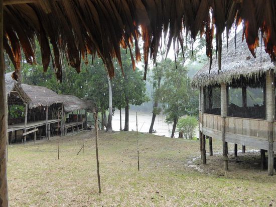 Reis, Kochbananen und Schinken zaubert die Küche auf den Tisch und zum Dessert frische Ananas. Inzwischen fliesst der Schweiss in Strömen und der Wunsch nach einem Tropenregen wird wach. Und wirklich, während alle eine Siesta halten, öffnen sich über uns die Schleusen und grosse Tropfen fallen vom Himmel. Es regnet mindestens eine Stunde und die Palmdächer können beweisen, dass sie den meisten Regen abhalten. Nur an einigen Stellen fallen Tropfen bis auf den Boden, andere versprühen einen feinen Nebel. Wie ein Feuchtigkeitsspray bei der Kosmetikerin fühlt es sich an.