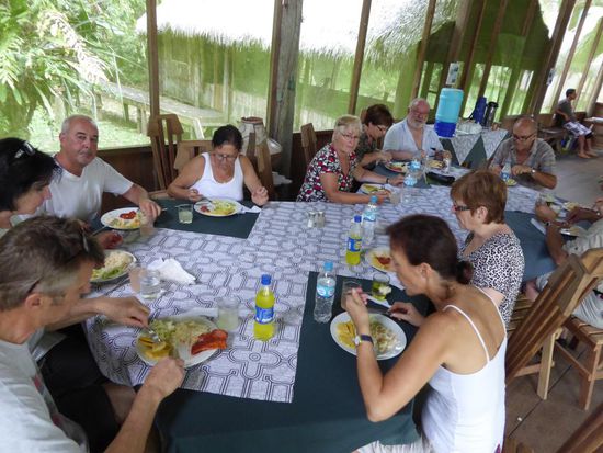 Vor dem Frühstück kommen sie zurück und bringen ein paar schöne Fotos mit. Nebst vielen Vögeln haben sie auch eine Anaconda entdeckt, der ein Fischernetz zum Verhängnis geworden ist. Statt dass sie die im Netz gefangenen Fische schnappen konnte, wird sie nun von den Piranas und Geiern selber verspeist.