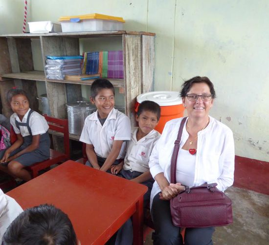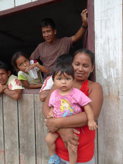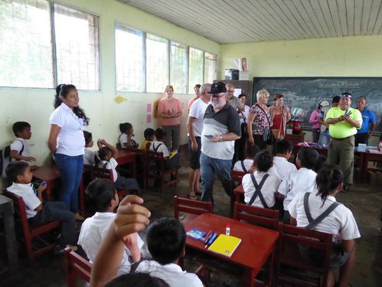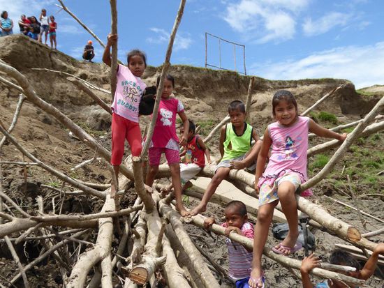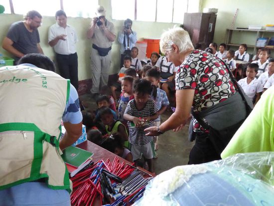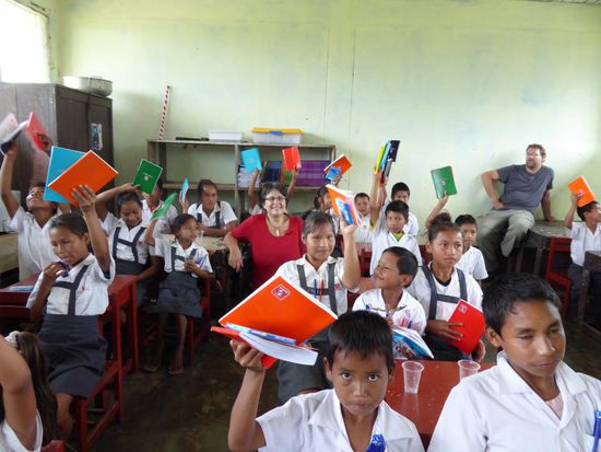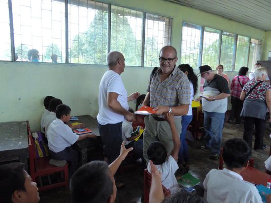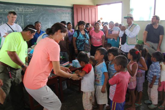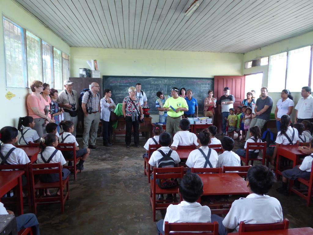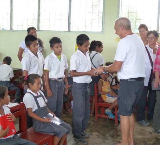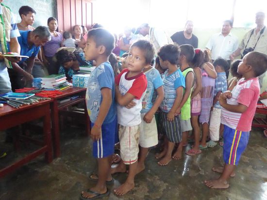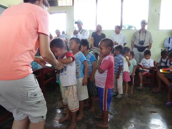 Im Dorf Castilla, das genau am Anfang des Amazonas liegt, werden wir erwartet. Die Kinder tragen heute zu Ehren der ausländischen Besucher ihre Schuluniform. Wir haben Schulmaterial wie Hefte, Farb- und Bleistifte, Gummis, Leim und vieles anderes mitgebracht und das verteilen wir an die Kinder.