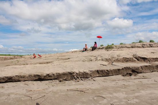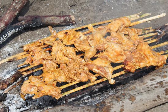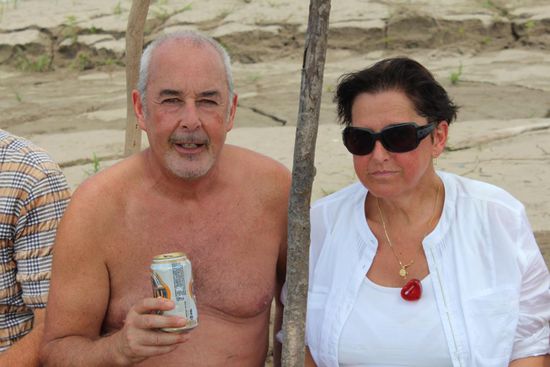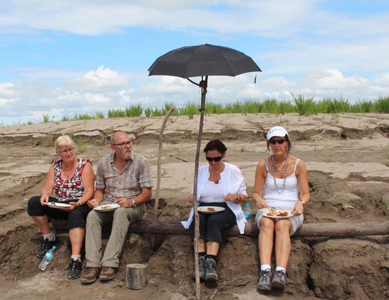 Und dann geht es noch einmal zurück über den Fluss. Mitten im Zusammenfluss von Maranon und Ucayali hat sich eine Sandbank gebildet. Hier hat unsere Küchenmannschaft inzwischen ein Picknick aufgebaut. Es gibt wunderbare Poulets vom Grill mit Salat und gekochten Kartoffeln.