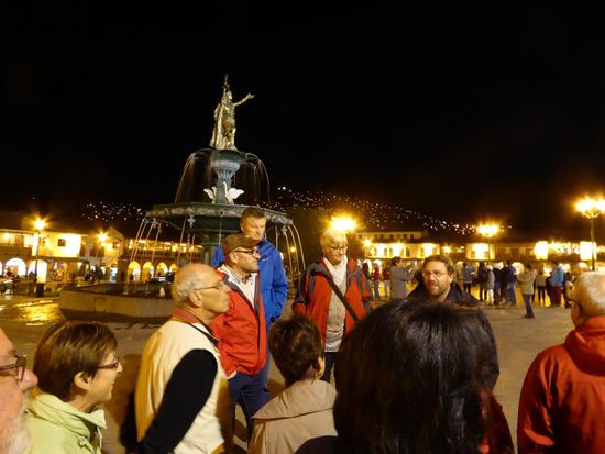 Um halb sieben treffen wir uns in der Hotellobby zu einem Spaziergang auf den nahen Hauptplatz. Sie ist beeindruckend und bezaubernd, die Stadt Cusco mit all ihren Lichtern, ihrer gewaltigen Kathedrale und dem schönen Brunnen auf dem Platz.