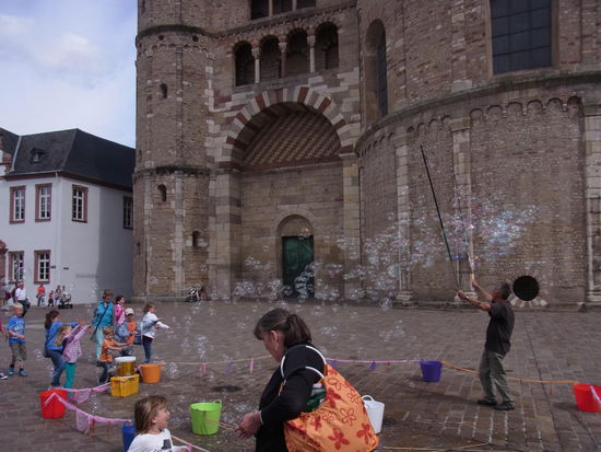Auf dem Domplatz fabriziert ein Mann wunderschöne Seifenblasen, wobei die Kinder großen Spass daran haben und wir beim Zuschauen.