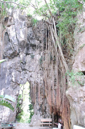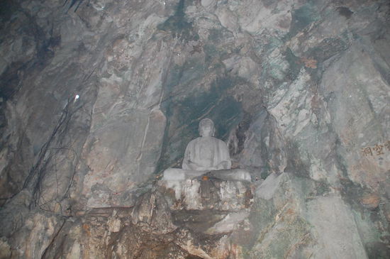 Hier geht man einige glatte, nasse Stufen in die Höhle hinunter, kaum Licht, Wasser tropft von den Decken und viel zu Dunkel, um den Buddha etwas weiter oben auf's Foto zu bringen