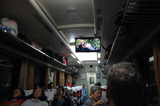 Obwohl es 9 Stunden Zugfahrt waren, ging die Zeit schneller um, als wenn man so lange im Flieger sitzt. Es gab auch nur ein paar Haltestellen. Wir haben grasende Wasserbüffel in unendlich vielen Reisfeldern gesehen, es hat mal geregnet, mal schien die Sonne, mal hatten wir ein kurzes Nickerchen gemacht. Einen TV gibt es auch, da lief auch z.B. zwischendurch mal so was wie "Verstehen Sie Spass", das kann man auch ohne die Sprache zu kennen verstehen. Dann haben sie gekocht, dann kam Werbung...also eigentlich recht kurzweilig. Nur, auf Toilette sollte man nicht müssen müssen.....
