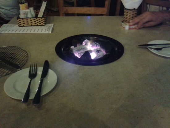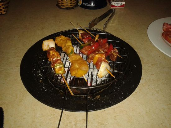 In der Nachbarschaft ist ein Restaurant, welches Barbecue anbietet. In der Mitte vom Tisch ein Grill, am Buffet das vorbereitete Fleisch.