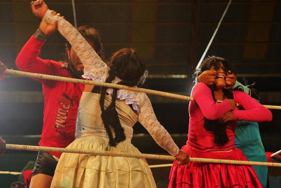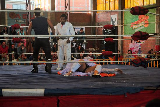 Glücklicherweise konnten wir hier neben den zahlreichen Schlafsälen auch einen Privatraum finden, der gleich mal mit 140 Bob`s (7,5 Bob ~ 1 €) zu Buche geschlagen hat. Noch am gleichen Abend ging`s für uns per Seilbahn, von denen es in La Paz drei verschiedene gibt, in den höchsten, bevölkertesten und gleichzeitig gefährlichsten Stadtteil nach „El Alto“. Kaum aus der Gondel ausgestiegen, waren wir schon mittendrin im größten Markt Südamerikas, auf dem man neben allem möglichen Scheiss auch Waffen und sonstiges illegales Zeux kaufen kann. Unser Grund jedoch, dem Stadtteil einen Besuch abzustatten, war das jeweils donnerstags und sonntags stattfindende Event „Lucha de las cholitas“. Ähnlich wie dem mexikanischen „lucha libre“, was von den Locals auch tierisch abgefeiert wird, bekämpfen sich hier die einheimischen Frauen, also die „cholitas“ in guter Wrestlingmanier und nehmen`s dabei auch mit den Männern auf. Da wir diese Tour im Gegensatz zu den anderen 90% der ausländischen Besucher nicht übers Hostel gebucht haben, sondern die Eintrittstickets erst vor Ort gekauft haben, hat`s direkt nur noch die Hälfte gekostet. Das ganze Spektakel entwickelte sich mit zunehmender Zeit zu einer richtigen Schlacht, bei dem fast das ganze Publikum mitwirkte und mal Orangen auf den fiesen Gegner schmiss, nur um kurze Zeit später das gekaufte Bier oder wahlweise auch drei Liter Colahumpen auf den gleichen zu verschütten. Leider sassen wir zwischen dem Ring und den fanatischen Einheimischen und immer wieder landeten irgendwelche Obststücke auf unseren Schoss, Gesicht, Kamera usw. An sich war das ganze recht witzig, aber schon übertrieben zugeschnitten auf die Ansprüche der Traveller und Touris.