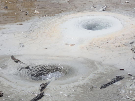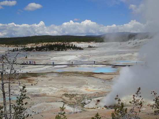 Am Samstag geht es bereits um 8.30 Uhr in Richtung YNP los. Es ist sehr erfrischend kalt bei 11°, aber die Vorfreude auf den heutigen Tag macht das wett. Außerdem lacht die Sonne im Moment auch vom Himmel. Erst fahren wir an die 35km um zum Grand Teton NP zu kommen, welcher mehr oder weniger die Einfahrt zum YNP bildet. Dann ist es so weit, ich las in den letzten Tagen viel über den NP, aber jetzt möchte ich diese Naturschauspiele auch sehen. Nach ein paar Kilometern bereits die erste Attraktion – direkt am Straßenrand steht ein Bison und grast seelenruhig vor sich hin. Das lässt sich absolut nicht durch die lästigen fotografierenden Touristen davon abhalten, sonst wären wohl alle schon ausgestorben bei den Mengen an Leuten. In weiterer Folge sehe ich schon die ersten Dunstnebel der „kochenden“ Quellen – Geysire – aufsteigen. Hier im NP ist wohl die dünnste Schicht zwischen Erdoberfläche und Magma im inneren der Erdkugel und aus diesem Grund kommt immer wieder das kochende Wasser bzw. Schlamm an die Erdoberfläche – siehe Beschreibung oben. Es ist unglaublich beeindruckend für uns – jedoch sicher mehr für mich, da Arno schon vor 24 Jahren das erste Mal hier war. Das Wasser oder teilweise auch Schlamm kommt kochend aus der Erdoberfläche – und riecht (stinkt) intensiv nach Schwefel. Immer wieder bleiben wir stehen um uns die öffentlich zugängigen Becken anzusehen bzw. im Gelände spazieren zu gehen. Die einzelnen Bassins schimmern in den verschiedensten Farben – auch hier kommt es darauf an, welche „Bodenschätze“ an die Oberfläche treten. Immer wieder passieren wir Waldteile welche bei den verschiedenen Bränden abgebrannt sind. Diese werden nicht um geschnitten, sondern dürfen so stehen bleiben wie sie sind, da sowieso die jungen Bäume nachkommen. Im gesamten Gelände liegen überall umgefallene Bäume wie Mikado Stäbchen herum – diese dürfen eben einem NP entsprechend so liegen bleiben und verwittern. Gesamt spulen wir 250km nur im Park herunter. Teilweise entlang des Yellowstone River – wo fleißig Fliegen gefischt wird – dann wieder an Bison Herden oder an Elchen vorbei. Zum Abschluss kommt der Höhepunkt – wir besuchen den so genannten Old Faithful Geysir. Ich habe ja im Vorfeld wirklich einiges darüber gelesen, aber dass dann ca. 500 Menschen vor dem Basin sitzen und warten, dass der Geysir spuckt, das habe ich in meinen kühnsten Träumen nicht erwartet. Wir haben großes Glück, nach etwa 15 Minuten Wartezeit sprühen die ersten Fontänen aus der Öffnung heraus. Old Faithful ist genau dafür so weltberühmt, dass nicht nur Wasserdunst aufsteigt, sondern dass auch ca. 2m hoher kochender Sprühregen an die Oberfläche kommt. Dieses Naturschauspiel dauert ca. 3 Minuten, bis etwa 60-90 Minuten auf die nächste Fontaine gewartet werden muss. Da es bereits spät ist und wir noch ca. 250km Rückweg haben verlassen wir schweren Herzens diesen einzigartigen NP. Auch wenn der Park voll von TouristInnen ist, er ist ein ganz besonderes Erlebnis auf unserer Reise. Die Rückfahrt wird erneut ein Rennen gegen die Regenwolken. Wieder ist Pan auf unserer Seite und die Wolken öffnen erst nach unserer Rückkehr die Schleusen.