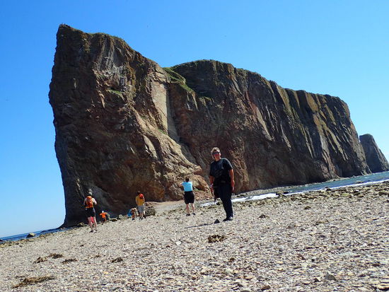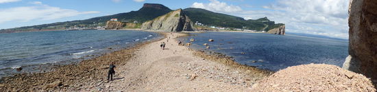 Am Freitag in der Früh ist es wie erwartet, von der Zeltplane rinnt das Wasser als würde es regnen – nein, es ist der Tau, denn seit langer Zeit lacht mal wieder die Sonnen vom wolkenlosen blauen Himmel – so eine Freude aber auch, da fällt das Aufstehen gar nicht schwer. Um 9.20 Uhr ist alle gepackt und los geht es für die Weiterfahrt der Küste entlang. Nach etwa hundert KM der erste Stopp beim Perce Felsen. Dabei handelt es sich um eine kleine Kalksteininsel – 433mx90mx88m - mit felsigen Klippen und einem natürlichen Bogen. Diese Ausmaße würden ein Gewicht von 5 Millionen Tonnen ergeben. Die Insel hat eine kleine Verbindung mit dem Festland welche man bei Ebbe zu Fuß überqueren kann. Zum Glück ist gerade Ebbe und wir steigen eine steile kurze Wiese hinunter, um auf die Insel wandern zu können. Die Felswand ist aufgrund der vielen Risse sehr beeindruckend. Am späten Nachmittag finden wir einen kleinen Campingplatz direkt am Benjamin River, wo wir die heutige Nacht verbringen werden. Ein traumhafter Sonnenuntergang lässt uns hoffen, dass das Wetter weiter so schön bleibt.