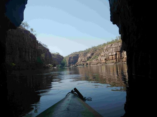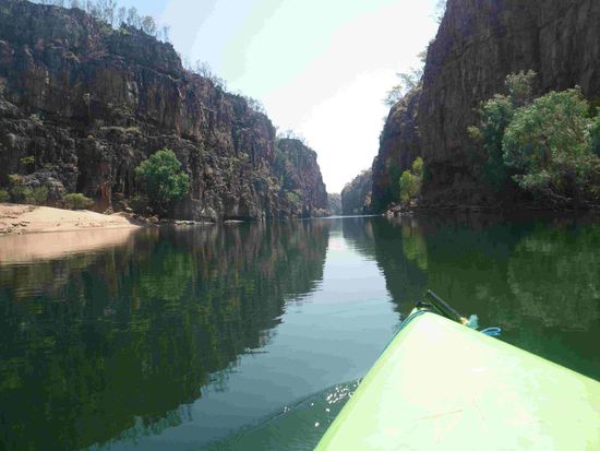Katherine Gorge zu schippern. Pünktlich um 9.00 Uhr sind wir gestellt - es ist im Moment absolute Flaute, und somit entsteht auch keine Wartezeit beim Besteigen der Kanus. Gelenkig wie eine junge Gazelle schwinge ich mich in das schwankende Etwas - in Wirklichkeit sieht es so aus, dass mir der nette junge Mann beim Bootsverleih sehr hilfsbereit in dieses unbequeme Plastikding hineinhilft bevor ich schon in aller Frühe im Wasser lande. Und los geht es - Arno hat mir angeboten nur dann zu paddeln, wenn ich Lust dazu hätte - falsche Aussage an Margit - Lust auf paddeln? Nachdem ich es probiere und mich nicht so doof wie beim Schnorcheln anstelle macht mir die Sache richtig Spaß. Wir schippern durch eine atemberaubende Schlucht in der es angeblich Süßwasserkrokodile geben soll - leider hat sich kein Einziges zum Fototermin gesellt! Nach etwa 1,5 km müssen wir aus dem Wasser, das Boot an den Strand ziehen um eine ausgetrocknete Stromschnelle zu passieren. Jetzt bin ich endlich in dem Ding drinnen, muss ich schon wieder raus - nun schaut mir außer Arno wenigstens niemand zu als ich mich heraus wurschtle - die Dinger sind wirklich eng und vor allem so kippelig. Über einen Steg geht es zur anderen Seite der Stromschnelle wo die nächsten Kanus schon herumliegen um benutzt zu werden. Also, wieder rein in eines und weiter geht es. Wir passieren noch ein zweites Mal eine trockene Stelle, hier tragen wir das Kanu über die Steine - bei 43° eine ziemlich schweißtreibende Angelegenheit. Jeder einzelne Tropfen ist es jedoch wert. Ihr müsst euch vorstellen wir sind hier ganz alleine, das Wasser plätschert ganz leise vor sich hin, in den Mauern der Schlucht zwitschern die Vögel und sonst nichts außer Natur pur. Das ist wirklich Labsal auf jede Seele - unbeschreiblich schön und atemberaubend. Das Kanu verlassen wir heute noch einige Male um in den verschiedensten kleinen natürlichen Becken baden zu gehen. Leider wird es zu schnell 16.00 Uhr, da wir um diese Zeit das Kanu zurück geben müssen. Dies ist wieder so ein Tag, an dem ich unendliche Dankbarkeit verspüre dies alles erleben zu dürfen. Unendlich müde bin ich nach diesem Tag, doch genau so glücklich bin ich auch.