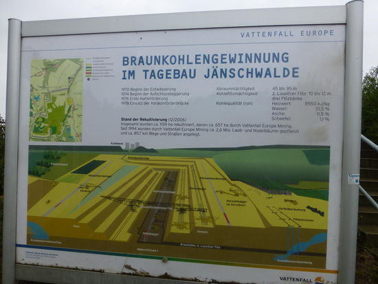 Wir fahren statt dessen weiter entlang der Grenze in Richtung Norden und schauen uns an einem Aussichtspunkt das riesige Loch des Tagebergbaus in Jänschwalde an. Schon sehr beeindruckend, auch wenn hier eher der Eindruck einer Mondlandschaft entsteht.