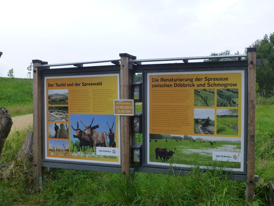 Die neue Spreeaue entsteht gerade als Ausgleichsmaßnahme für den Braunkohle-Tagebau des Energiekonzerns Vattenfall. Er investiert hier etliche Millionen Euro in Renaturierungs-Projekte. Unter anderem wurden die Heckrinder - eine Nachzüchtung der ausgestorbenen Aucherochsen und als "Aueroxen" bezeichnet, sowie Wasserbüffel und Wildpferde angesiedelt. Außerdem werden acht neue Teiche angelegt und mit Karpfenzucht bewirtschaftet. Hinzu kommen etliche bestandsbedrohte Pflanzen- und Kleintierarten, die hier ein neues, natürliches Refugium vorfinden. Einiges ist bereits fertig gestellt, andernorts finden die landschaftgestalterischen Arbeiten noch statt.