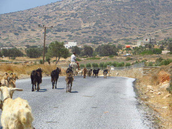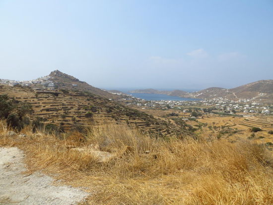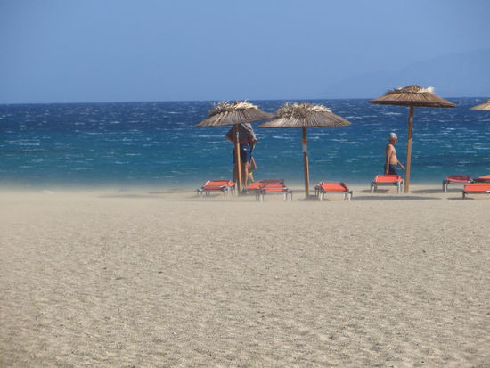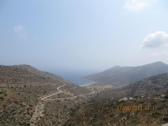 Für den nächsten Tag nahmen wir uns einen Mietwagen. Durch die griechische gebirgige und karge ging es nach Norden zu Homer`Grabstätte. Das Grab bestand dann vor traumhafter Kulisse mit Weitblick aus ein paar aufgehäuften Steinen. Ein kurzer Blick reichte dann und es zog uns zum Strand. Wir haben auf Empfehlung einen schönen Strand angesteuert. Allerdings konnten wir dort nicht bleiben, weil es zu windig war. Man sah schon von Weitem, wie die Leute am Strand vom Sand gepeitscht wurden. Also die steilen Serpentinen wieder zurück und quer über die Insel zu einem anderen Strand in der Hoffnung, dass es dort windgeschützter ist. Es war zwar windig, aber auszuhalten.