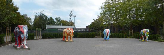 Der gläserne Elefant ist nicht der einzige! Bereits unmittelbar hinter dem Eingang befinden sich zahlreiche bunte bemalte Elefanten