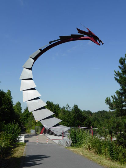 Über die sog. Drachenbrücke queren wir die vielbefahrene Crange Straße. Die Brücke stellt sich in Form eines Drachenskelettes dar, dessen Rippen als Halter für das Geländer dienen. Drachenhals und -kopf sind zurückgewandt, als würde der Drache auf seine Besucher hinunterblicken.