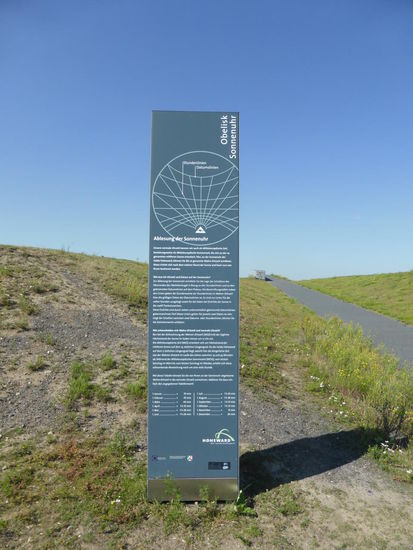Die rund 3.000 m² große Horizontalsonnenuhr liegt auf dem südlichen Plateau in einer Höhe von etwa 140 m ü. NN. Als Zeiger dient ein exzentrisch stehender, 8,50 m hoher Edelstahl-Obelisk, der seinen Schatten auf die kreisrunde Fläche mit einem Durchmesser von 62 m wirft. Die Oberfläche, welche das Solarium des römischen Kaisers Augustus zum Vorbild hat, besteht aus hellen Pflastersteinen. Durchzogen wird es von 20 cm breiten Bahnen aus schwarzem Pflaster.