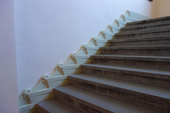 farblich abgesetzte Säulensockel im Keller - angedeutete Kapitelle mit Bögen in der oberen Etage.