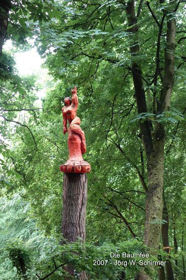 Wir hatten auch noch etwas über einen Skulpturenpark gelesen, den wir allerdings nicht auf Anhieb finden. Die Dame am Empfang des Schlosses kann uns trotz Internetrecherche und Nachfragen beim Chef auch nicht weiterhelfen. So starten nach einer Runde durch den offenen Schloßpark zur nächsten Etappe. Doch auf einmal sehe ich westlich der Adenauerallee im Wald etwas Buntes. Wir habenihn gefunden den Skulpturenpark 'Kunst am Baum'!