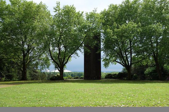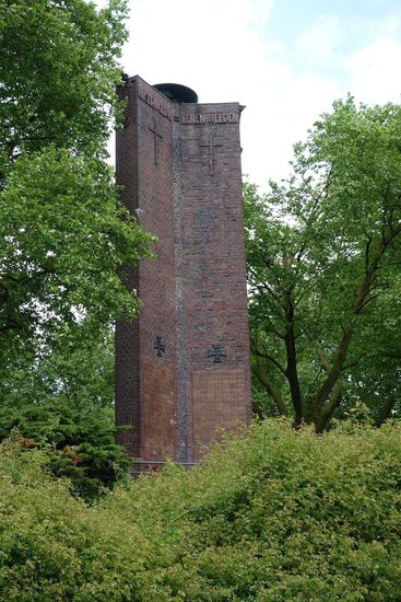 Am Ende des Park steht ein großes Mahnmal zu Ehren der Gefallenen - von der Anhöhe hat man eine gute Sicht auf das Stadion des Fußballvereins Schalke 04.
