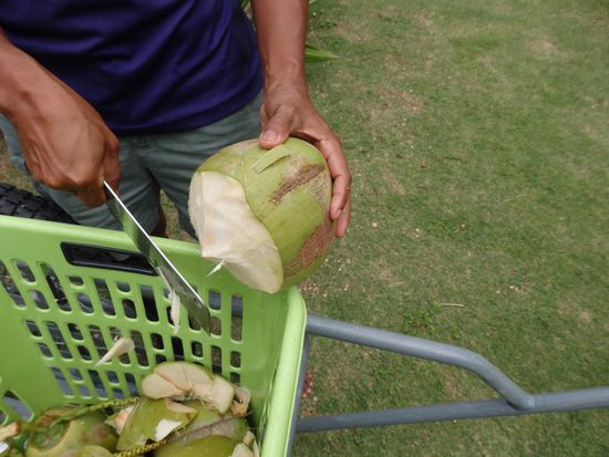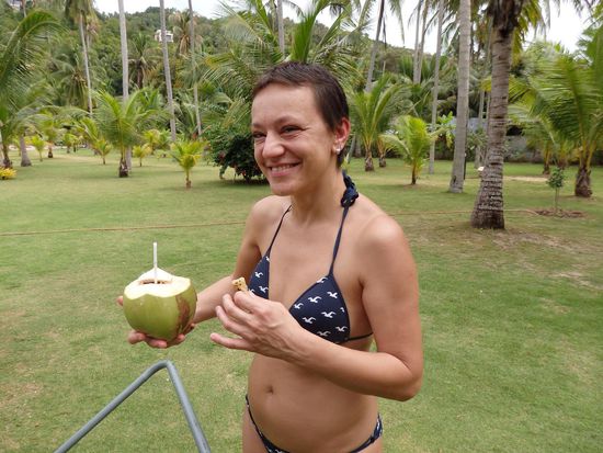 Wir freuen uns, dass Get uns, ganz frisch vom Baum, (jedem Bewohnern der Anlage) so viel Nüsse öffnet, wie man möchte. Die Kokosnüsse sind prall voll mit Saft, das Fruchtfleisch ganz zart und lecker.