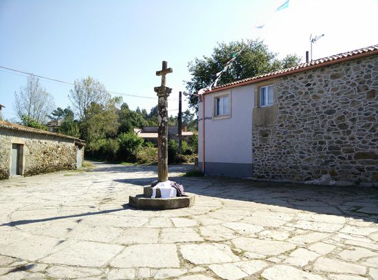 Casa Domingo mit einer Riesenmuschel ist die erste Station. Idyllische Hohlwege, gesäumt von Eichenwäldern führen uns heute durch zahlreiche galizische Dörfer. Typische Steinhäuser und die Brücken sind die touristischen Highlights entlang des Camino an diesem Tag.