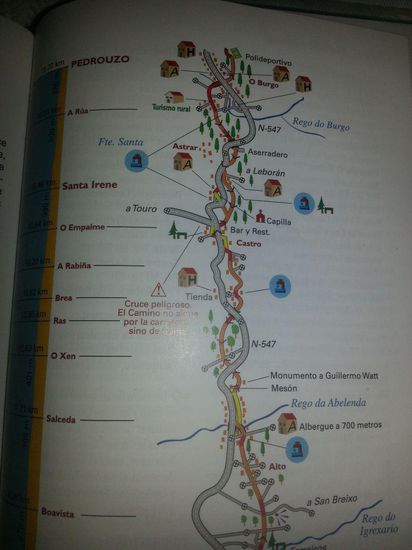 Bei Kilometer 48,5 treffen wir einen Bekannten vom Vortag wieder, der dort Stempel mit Siegelwachs und Leiberl mit speziellem Aufdruck ("Ein Kind, ein Sonnenstrahl") verkauft. Bis kurz danach führt uns der Weg im Schatten durch die Wälder. Dann begleitet uns der "Duft" des Camino bis Boente.