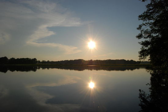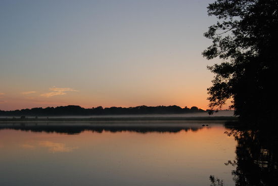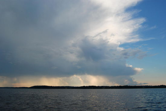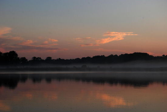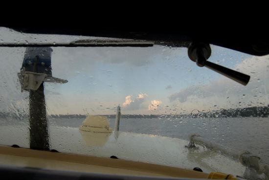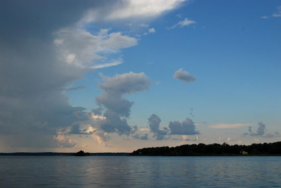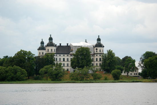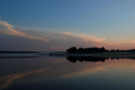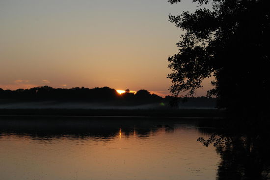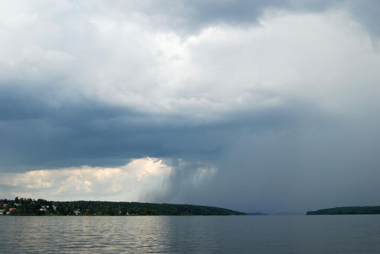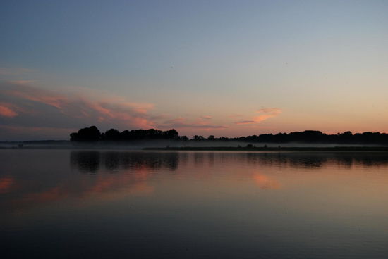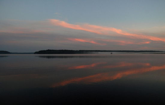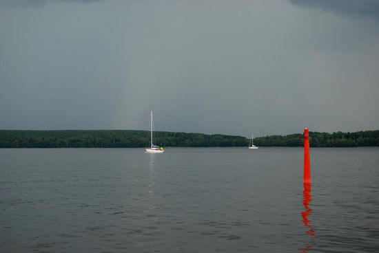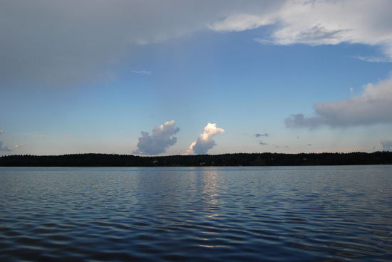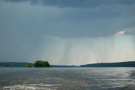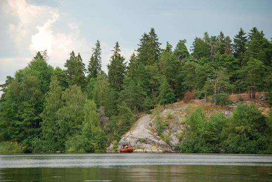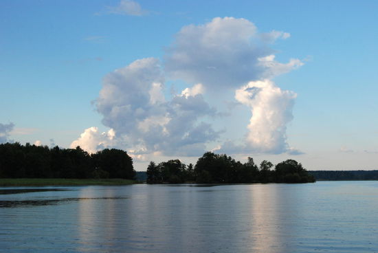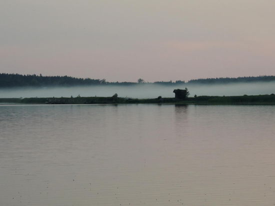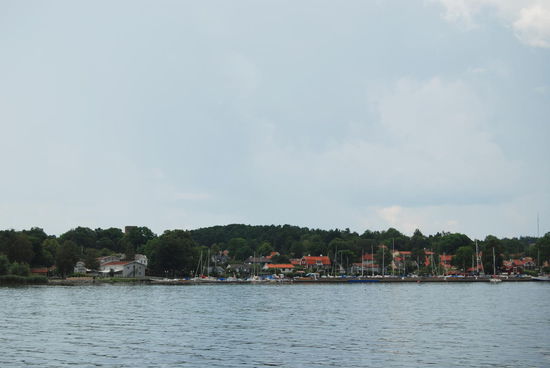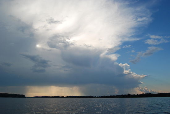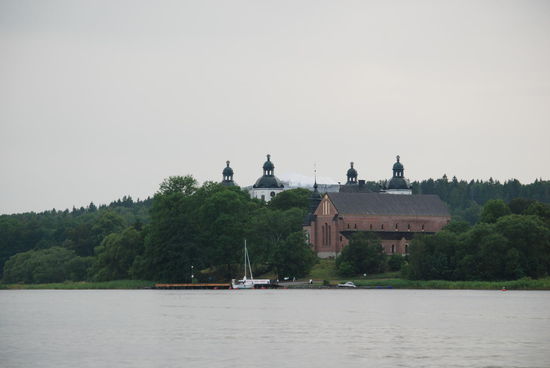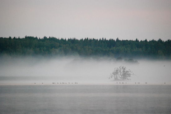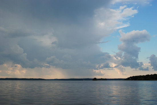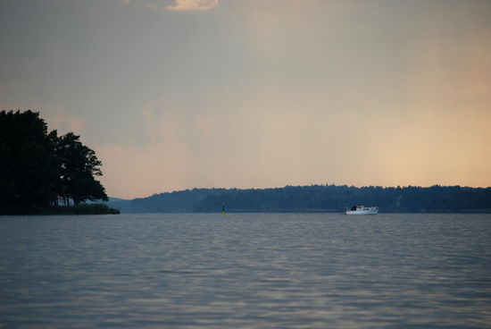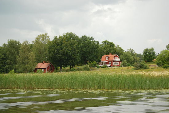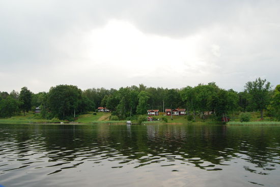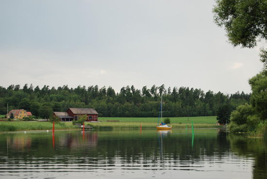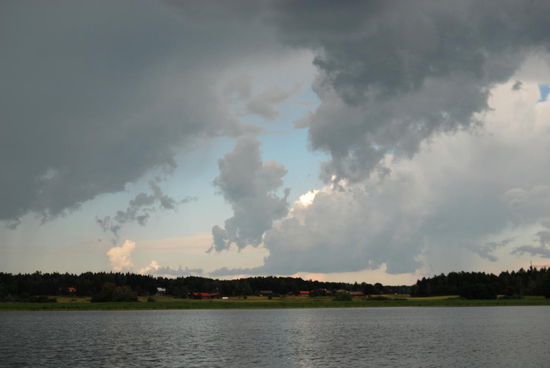 Am nächsten Tag machten wir nur noch ein paar kleine Einkäufe. Als wir dann losfahren wollten, zogen dunkle Wolken auf. Rund um uns gab es mehrere Gewitter, aber bei uns in der Mitte war es einigermaßen schön. So entschlossen wir uns, trotzdem in Richtung Norden loszufahren. Es regnete zwar auch eine Zeit, so daß wir mit geschlossener Kapell fahren mußten, trotzdem hatten wir noch Glück mit dem Wetter. Man kann hier bis nach Uppsala fahren, wir bogen aber vorher nach Westen und dann nach Süden ab auf dem weitverzweigten Mälaren. Am Abend hatten wir etwas Schwierigkeiten, einen geeigneten Übernachtungsplatz zu finden. Schließlich ankerten wir an einer Halbinsel in der Nähe eines Herrgårds. Hier erlebten wir einen herrlichen Sonnenuntergang und konnten zusehen, wie nach den Regenfällen der Nebel langsam zum See kroch.
