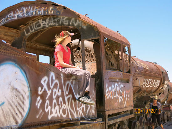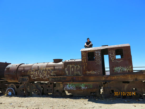 Nicht weit entfernt von Uyuni war unser erster Stopp, der Zugfriedhof. Dort versuchten Engländer und Franzosen mithilfe von Zügen die Bodenschätze aus der Salzwüste herauszuschaffen, hat aber eher ned so funktioniert, denn die die Züge rosten so vor sich hin.