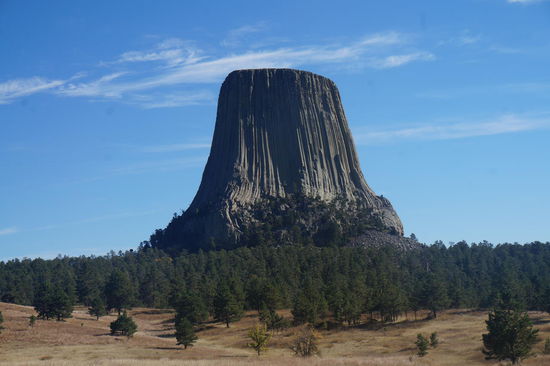 Der Devils Tower ist ein National Monument. Er ist vulkanischen Ursprungs und ragt weit sichtbar aus der Umgebung hervor.