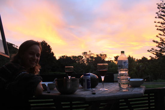 Mit unserem Job in Piha hatten wir sehr vel Glueck. Es ist echt wunderschoen hier! Wir arbeiten bei einem Oeko-Hotel zu dem 2 Huetten fuer jeweils 2 und 4 Personen gehoeren und die am Hang im tropischen Buschwald mit Fahnenpalmen etc. stehen. Auf dem ganzen Gelaende wird Permakultur betrieben, weshalb man nur bestimmtes Shampoo, Reinigungsmittel etc. benutzen darf, weil sonst die Wurmkulturen zerstoert werden wuerden. Unsere Chefin Lynn bietet ausserdem Retreats mit Soul Therapie und Yoga an und hat mehrere Jahre in verschiedenen Retreats in Peru verbracht. Ausserdem wohnt ihre 30-jaehrige Tochter Lisa hier, der Hund Randy und 9 Huehner.