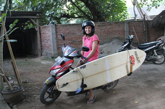 Weil die Straende um Kuta herum nicht zu Fuss erreichbar sind, waren wir am zweiten Tag gezwungen uns wie alle anderen auch einen Motorroller mit Surfbretthalterung zu mieten. Jeder Homestay vermietet Roller, selbstverstaendlich ohne jegliche Art von Versicherung. Es war etwas kompliziert gute Surfspots zu finden, weil es mehrere Surfstraende in der Naehe von Kuta gibt und die einen besser bei Ebbe funktionieren, die einen besser bei Flut, an manchen Tagen gibt es keine Wellen, an anderen sind die Wellen viel zu hoch, zumindest fuer uns... Ausserdem kommen die meisten Leute nach Kuta um dort zu surfen, weshalb die guten Surfsports meistens vollkommen ueberfuellt sind. Am zeiten Tag waren wir beispielsweise am Traumstrand in Selong Belanak wo ca. 100 Leute auf genau einer Anfaengerwelle gesurft sind. Deswegen sind wir am Tag danach mit unserem spanischen Freund aus dem Flugzeug und ein paar anderen nach Gerupak gefahren, wo man ein Boot mieten muss, mit dem man dann fuer 2 Stunden zu einem Spot mitten in einer Bucht gebracht wird, wo allerdings auch mindestens 70 Leute gleichzeitig um die Wellen kaempfen. Trotzdem war es echt schoen manchmal nur auf dem Surfbrett im Wasser zu sitzen und die entfernten von Palmen gesaeumten Straende und das Meer zu geniessen.