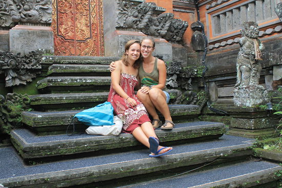 Dort angekommen wollten wir uns einen guenstigen Homestay suchen, von denen es laut Lonely Planet viele in unserer Strasse – Jalan Kajeng – geben soll. Wir waren anfangs etwas irritiert vom Starbucks am Ende unserer Strasse und den vielen tempelartig aussehenden Hauseingaengen, die alle so aussahen als ob sie unser Budget bei weitem uebersteigen wuerden. Letztendlich haben wir dann aber ein schoenes Zimmer mit eigenem Balkon mit Blick auf ein gruenes Tal in einem Homestay bei einer sehr netten Frau und deren Familie gefunden, die uns jeden Morgen traditionelles balinesisches Fruehstueck bestehend aus Reiskuchen mit Kokos und Fruechten serviert hat und sich insbesondere als es Lara nicht so gut ging, sehr liebevoll gekuemmert hat, dazu aber spaeter mehr... Es war dort wirklich sehr entspannt bis auf die Tatsache, dass wir jeden Morgen spaetestens um 5 Uhr morgens von lauten Haehnen unseres Homestays und denen der Nachbarschaft geweckt wurden und daraufhin puenktlich um spaetestens 7 Uhr von laut schreienden Kindern direkt unter unserem Zimmer, was Chris jeden Morgen fast in den Wahnsinn getrieben hat!
